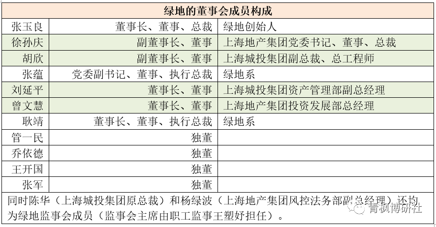從綠地控股集團(tuán)的董事會(huì)構(gòu)成來(lái)看,其11名董事中,分別有兩位來(lái)自上海城投集團(tuán)(即胡欣和劉延平)和上海地產(chǎn)集團(tuán)(即徐孫慶和曾文慧),也即上海市國(guó)資委旗下在綠地的董事會(huì)中派駐4位成員,占全部董事人數(shù)的1/3以上,超過(guò)衍生于綠地的3名董事(即張玉良、張?zhí)N和耿靖),這意味著上海國(guó)資委雖然對(duì)綠地董事會(huì)各議項(xiàng)實(shí)際上是有一定控制權(quán)(起碼有比較確定的否決權(quán)或重大影響),這大概也是市場(chǎng)把綠地視為國(guó)企的主要原因。