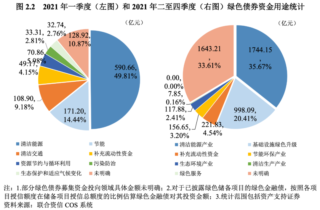 在綠色債券資金用途方面,2021年一季度,沿用《綠色債券支持項目目錄(2015年版)》分類進行統計,綠色債券募集資金主要用于清潔能源和節能領域,其中投向清潔能源領域的資金占募集資金總規模的49.81%,位列第一位;投向節能領域的資金占募集資金總規模的14.44%,位列第二位;投向清潔交通領域的募集資金占比9.18%,位列第三位。2021年二季度起使用《綠色債券支持項目目錄(2021年版)》進行統計[7],規模前三的分別是清潔能源產業(占比35.67%)、基礎設施綠色升級產業(占比20.41%)、節能環保產業(占比4.54%)??傮w來看,募集資金主要投向清潔能源領域,同時未明確資金投向具體領域的比例顯著上升。