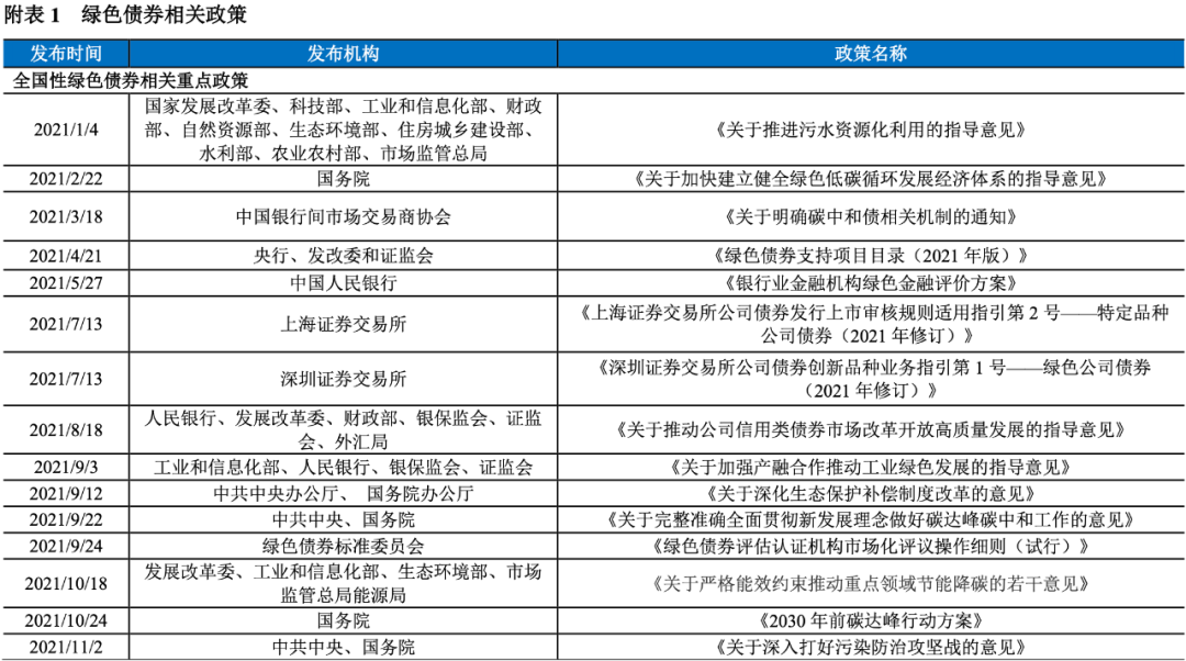 支持多領域綠色債券發行和擴容。2021年1月4日,國家發改委等十部門印發《關于推進污水資源化利用的指導意見》,指出鼓勵企業采用綠色債券、資產證券化等手段,依法合規拓寬融資渠道,推動我國污水資源化利用實現高質量發展。2021年2月22日,國務院印發《關于加快建立健全綠色低碳循環發展經濟體系的指導意見》,指出大力發展綠色金融,發展綠色直接融資,加大對金融機構綠色金融業績評價考核力度。2021年7月27日,發改委等三部委發布《關于鼓勵家電生產企業開展回收目標責任制行動的通知》,指出將完成回收目標并達到國家有關管理要求的責任企業納入家電生產企業“綠色責任名單”,在企業發行綠色債券、綠色信貸審批時優先支持。2021年8月18日,央行等六部委發布《關于推動公司信用類債券市場改革開放高質量發展的指導意見》(以下簡稱《意見》)指出,擴大“雙創”債券、綠色債券發行規模。2021年9月12日,中共中央辦公廳和國務院辦公廳印發《關于深化生態保護補償制度改革的意見》,指出拓展市場化融資渠道,鼓勵符合條件的非金融企業和機構發行綠色債券。2021年9月22日,國務院發布《關于完整準確全面貫徹新發展理念做好碳達峰碳中和工作的意見》,指出支持符合條件的企業上市融資和再融資用于綠色低碳項目建設運營,擴大綠色債券規模。2021年10月18日,國家發改委等四部委聯合發布《關于嚴格能效約束推動重點領域節能降碳的若干意見》,指出拓展綠色債券市場的深度和廣度,支持符合條件的節能低碳發展企業上市融資和再融資。2021年10月24日,國務院印發《2030年前碳達峰行動方案》,指出大力發展綠色債券等金融工具,拓展綠色債券市場的深度和廣度,有助于推動綠色債券市場擴容。2021年11月2日,中共中央、國務院發布《關于深入打好污染防治攻堅戰的意見》,指出大力發展綠色信貸、綠色債券、綠色基金,加快發展氣候投融資,強化對金融機構的綠色金融業績評價。2021年11月10日,國務院辦公廳發布《關于鼓勵和支持社會資本參與生態保護修復的意見》,指出推動綠色基金、綠色債券、綠色信貸、綠色保險等加大對生態保護修復的投資力度;積極支持符合條件的企業發行綠色債券,用于生態保護修復工程。2021年11月27日,國資委印發《關于推進中央企業高質量發展做好碳達峰碳中和工作的指導意見》,指出積極發展綠色金融,有序推進綠色低碳金融產品和服務開發,拓展綠色債券的業務范圍。中央和各部委多次發文有助于拓寬不同領域綠色低碳企業的融資渠道,推動相關領域綠色債券發行。