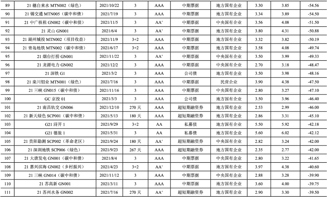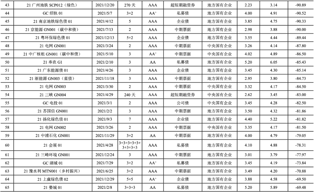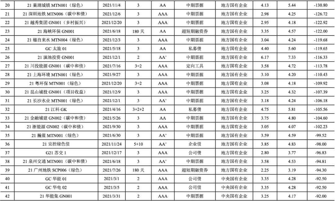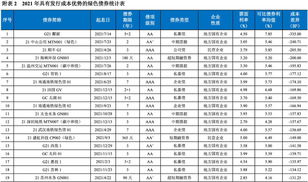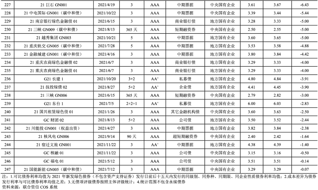 2021年,我國共有247期綠色債券的發行利率低于可比債券[14]的平均發行利率(詳見附表2),占比達到72.01%。2021年具有成本優勢的綠色債券的加權平均息差[15]為-24.64BP。具有成本優勢的綠色債券以國有企業(241期)為主,民營企業4期,公眾企業2期。