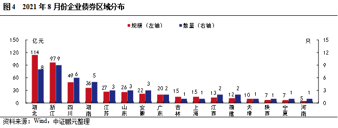 2021年8月,共有16個省份發行了企業債券。其中,湖北省和浙江省分別發行114.30億元和96.50億元,規模遠高于其他省份,其次,四川省和湖南省分別發行49.40億元和36.20億元。從發行數量上看,浙江省和湖北省分別發行9只和8只,四川省和湖南省分別發行6只和5只,其他省份發行數量較少。與上年同期相比,8月分,有8個省份發行規模較上年同期出現增長,其中,浙江省同比增長311%;有6個省份發行規模同比出現下降,其中廣東省下降71%,而云南、重慶、甘肅和河北本月未發行。