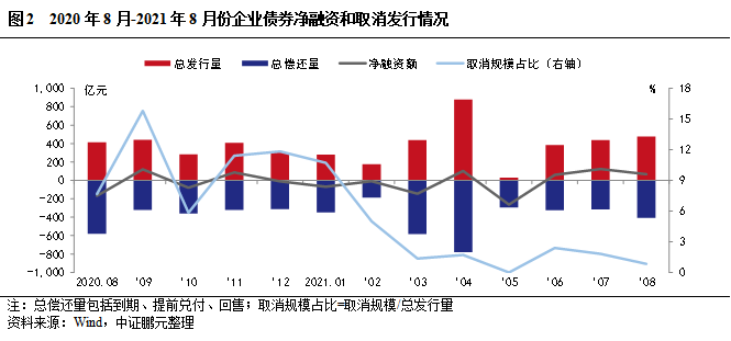 從凈融資情況來看,8月企業債券總發行規模475.10億元,總償還規模407.94億元,本月表現為凈發行67.16億元,上年同期為凈償還167.17億元。此外,2021年8月有2只企業債券取消發行,原計劃發行規模4億元。2021年1-8月份,企業債凈融資表現為凈償還133.74億元,較上年同期凈償還規模減少1,164.53億元。
