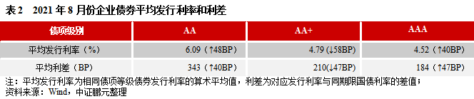 2021年8月,企業債券最高發行利率為6.90%,較上月持平;最低發行利率為3.05%,較上月下降6BP。從債券級別來看,與上月相比,本月AA級和AAA級企業債平均發行利均上行,平均發行利差均擴大;AA級企業債平均發行利率下行58BP、利差收窄47BP。