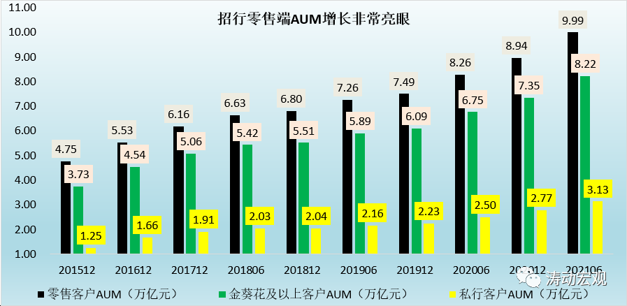 2、實際上從絕對值上來說,招行零售端AUM(這里的AUM均為月日均口徑)亦非常亮眼,遠遠超過同業水平,2021年6月底招行零售客戶AUM達到9.985萬億元(時點規模已突破10萬億元大關)、金葵花及以上客戶AUM達到8.22萬億、私行客戶AUM達到3.13萬億。相較于2020年底,今年上半年零售客戶AUM、金葵花及以上客戶AUM和私行客戶AUM的增量分別達到1.04萬億、0.88萬億和0.35萬億。