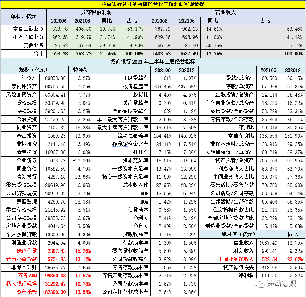 3、今年上半年,招行金葵花及以上客戶數和私人客戶數分別凈增33.48萬戶和1.20萬戶,公司客戶數凈增4.36萬戶、小企業客戶數凈增4.34萬戶、信用卡流通卡凈增227.03萬張。特別是,招行App理財投資客戶數大幅增長530.88萬戶(較2020年大幅增長51.39%)。