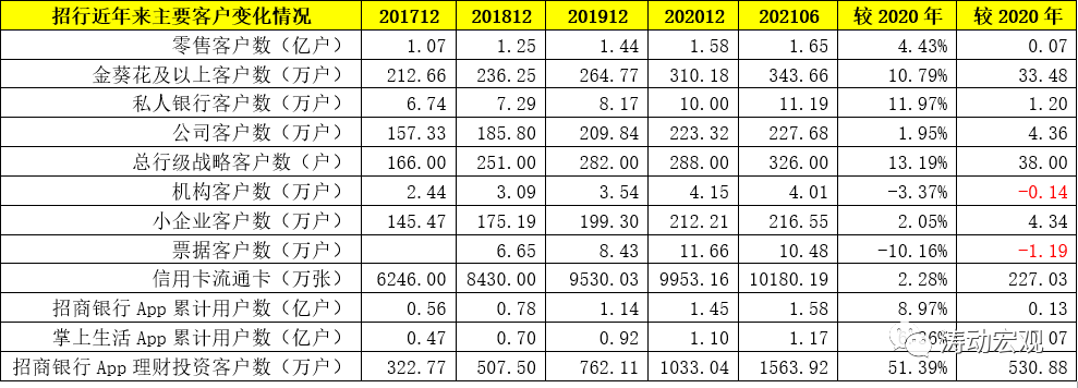 截至2021年6月底,招行零售客戶數與公司客戶已分別達到1.65億戶和227.68萬戶,金葵花及以上客戶數和私行客戶數分別達到343.66萬戶和11.19萬戶,招行App累計用戶數和掌上生活App累計用戶數分別達到1.58億戶和1.17億戶,信用卡流通卡達到1.02億張。