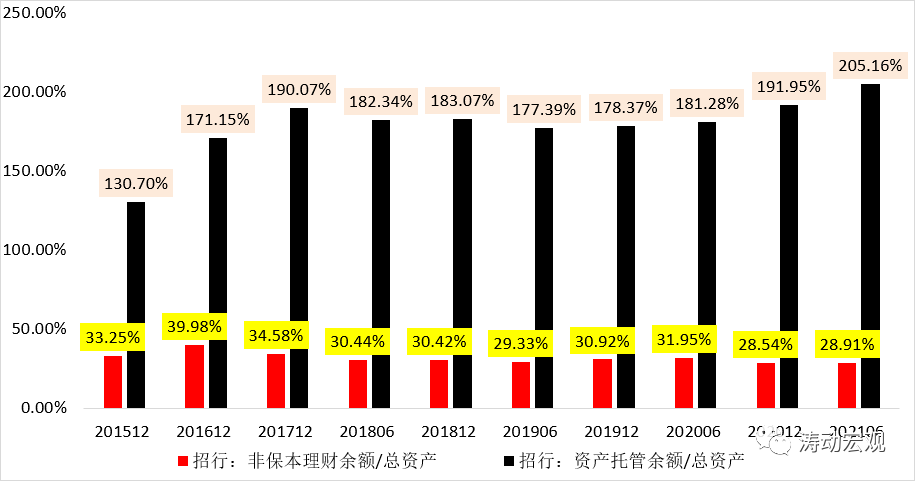 1、招行特別重視表外業務,這從FPA內涵、非保本理財以及資產托管等方面便可以看出來。2021年6月底,招行的非保本理財規模和資產托管規模分別達到25685.77億元和18.23萬億,占其總資產的比例分別達到28.91%和205.16%。