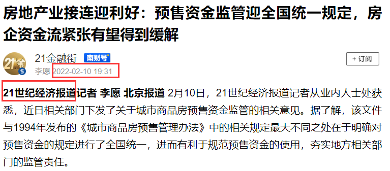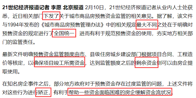 2月10日晚上19:30附近,財聯社和21世紀兩家媒體幾乎同時發出新聞,吹風“預售資金監管放松利好房企”,朋友圈首先刷屏一波。