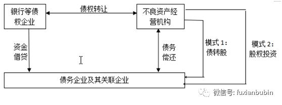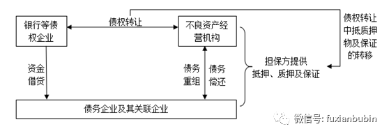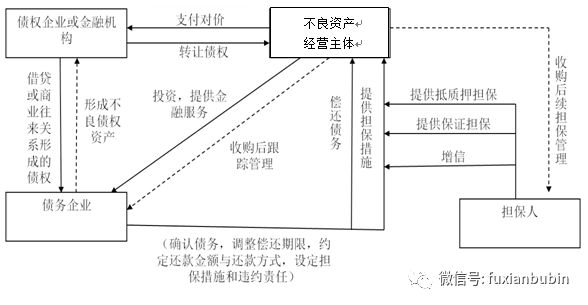 在具體的業務模式上,不良資產經營機構可以從銀行等債權企業以債權轉讓的方式收購不良資產之后,啟動債務重組業務,通過還款時間、金額、還款方式以及擔保抵押等一系列的重組安排,實現未來債權的回收。具體交易結構如下圖所示: