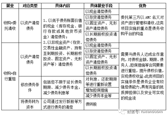 根據《企業會計準則第12號——債務重組》第3條規定,債務重組主要包括“以資產清償債務、將債務轉為資本,修改其他債務條件(包括但不限于延長債務償還期限、延長債務償還期限并加收利息、延長債務償還期限并減少債務本金或債務利息),或以上手段的綜合使用”。在不良資產經營業務視角下,債務重組業務可做如下對應: