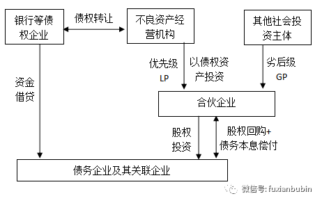 如果項目較為復雜,需要資金量較多,在這種情況下,可以考慮通過設立基金的方式(以合伙制私募基金為主)進行債務重組,根據“私募新規”規定,私募股權投資基金的股權和債權以不超過8:2的比例進行投資。具體交易結構如下圖: