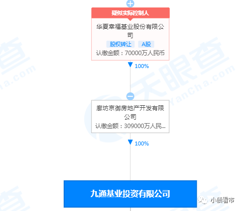 從股權(quán)結(jié)構(gòu)看,九通投資是京御房地產(chǎn)100%控股子公司,是華夏幸福間接全資子公司,公司實(shí)際控制人為王文學(xué)。
