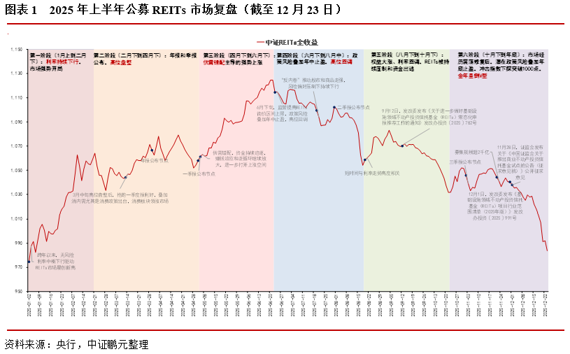 2025年我國(guó)公募REITs市場(chǎng)走勢(shì)呈現(xiàn)倒V型,先漲后跌,指數(shù)年內(nèi)最高漲幅達(dá)16%,臨近12月底,累計(jì)跌幅回調(diào)至2%左右。截至12月23日,2025年中證REITs全收益指數(shù)報(bào)收983.81點(diǎn),年內(nèi)漲幅回調(diào)到1.65%,下半年市場(chǎng)的持續(xù)下跌拖累REITs在大類資產(chǎn)漲跌幅排名中表現(xiàn)靠后。從板塊來(lái)看,消費(fèi)基礎(chǔ)設(shè)施REITs領(lǐng)漲市場(chǎng),除了個(gè)別項(xiàng)目與年初持平,其余年內(nèi)漲幅達(dá)18%-40%。市場(chǎng)持續(xù)擴(kuò)容,全年共新發(fā)行REITs產(chǎn)品22只,其中首發(fā)20只,發(fā)行規(guī)模為407.81億元,同時(shí)2單擴(kuò)募項(xiàng)目,華夏北京保障房REIT擴(kuò)募規(guī)模為9.46億,國(guó)泰海通臨港創(chuàng)新產(chǎn)業(yè)園REIT擴(kuò)募規(guī)模為17.23億。流動(dòng)性方面,市場(chǎng)活躍度顯著增強(qiáng),2025年全市場(chǎng)日均成交額達(dá)5.9億元,較2024年同期的4.21億元大幅提升40%。2025年以來(lái)我國(guó)公募REITs二級(jí)市場(chǎng)走勢(shì)可以分為六個(gè)階段: