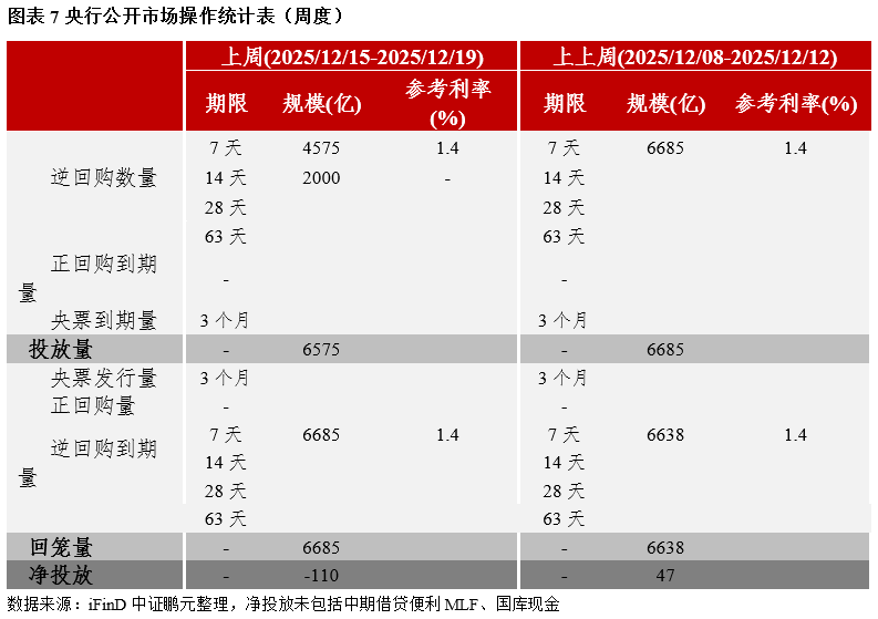 上周(2025/12/15-2025/12/19)流動(dòng)性相對(duì)平穩(wěn),回購(gòu)利率漲跌互現(xiàn)。具體來(lái)看,隔夜利率較前一周上行0.44BP至1.35%,7天回購(gòu)利率上行0.73BP至1.51%。中等期限方面,14天回購(gòu)利率上行6.91BP至1.62%,21天回購(gòu)利率上行16.06BP至1.72%,1個(gè)月回購(gòu)利率下行0.62BP至1.69%。