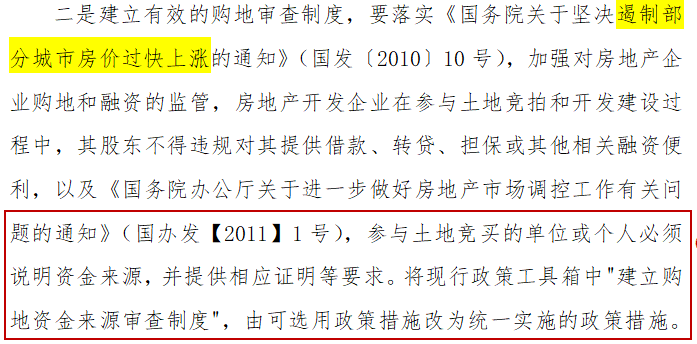 競買人的資金必須為自有資金。建立有效的購地資金審查制度,加強對房地產企業購地和融資監管,房地產企業在參與土地競拍和開發建設過程中,其股東不得違規對其提供借款、轉貸、擔保或其他相關融資便利。參與土地競買的單位或個人必須說明資金來源,并提供相應證明等要求。將現行政策中“建立購地資金來源審查制度”,由可選用政策措施改為統一實施的政策措施。
