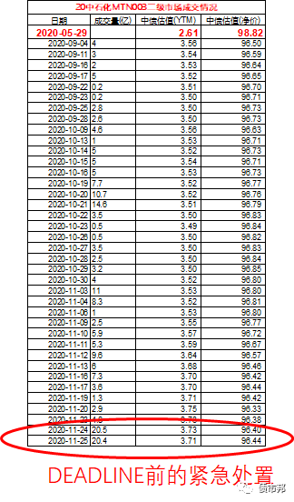 其實在5月底的時點,市場指標給出了明確的利率上行信號。但是主承并沒有選擇早點割肉,減少損失,而是一路硬扛到了9月4號才開始第一筆的處置,而持倉的大頭的處置還是在11月24號和25號兩天完成的。為什么前面處置都是細雨綿綿,這兩天確是如此之猛烈呢?回頭看看MTN03的發行時間就知道了,5月29號,11月25號差不多是接近銀保監會要求的6個月處置極限了,即使虧損,也必須賣了。