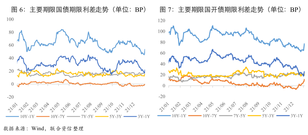 利率債收益率曲線趨于平坦化。2021年利率債短端收益率下行幅度不及長端收益率下行幅度,10Y-1Y期限利差震蕩下行,利率債收益率曲線趨平。特別是下半年以來,受實體經濟融資需求不足、經濟下行壓力加大及短端資金利率下行幅度有限等因素影響,利率債收益率曲線平坦化趨勢較為明顯。從各主要期限利差走勢特點看,利率債收益率曲線走平主要是由于3Y-1Y期限利差收窄所致,這在一定程度上反映出市場對短期經濟下行壓力的擔憂有所加深。此外,2021年下半年以來,10年期和7年期國債收益率、國開債收益率均出現“倒掛”,反映出市場對經濟在中長期表現的擔憂。