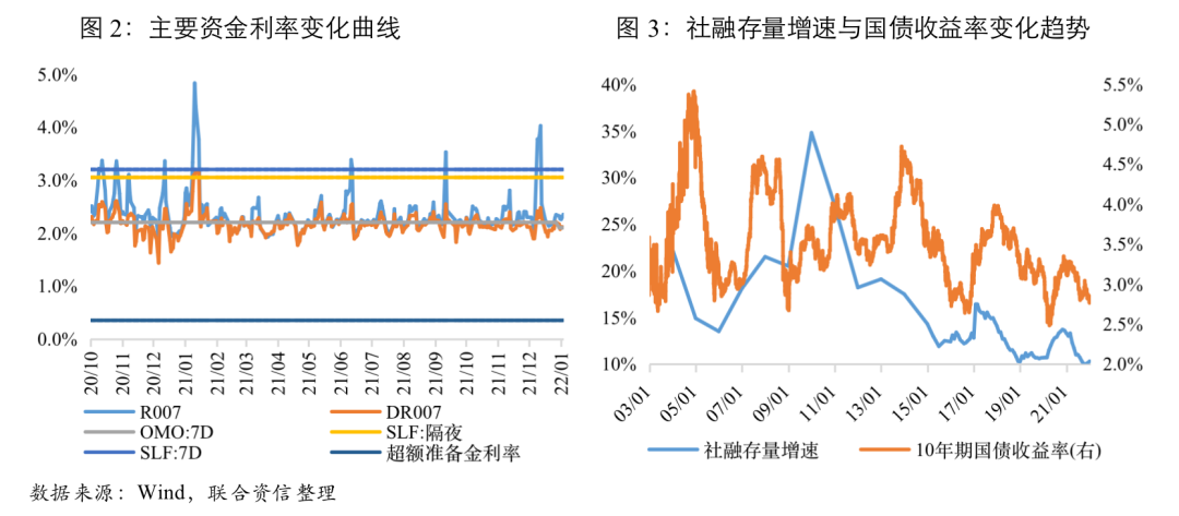 2021年12月以來,各類會議頻頻釋放穩增長信號,市場對寬信用和寬貨幣預期愈加濃厚。央行在2022年工作會議上明確,要切實擔負起穩定宏觀經濟的責任,主動推出有利于經濟穩定的貨幣金融政策,增強信貸總量增長的穩定性,加大對實體經濟的支持力度。2022年1月17日,MLF和7天逆回購利率同時下調10BP,雖然降息在市場預期內,但降息幅度超過市場預期,消息公布后10年期國債收益率迅速下行后小幅回升。回顧歷史上的多次降息后國債利率在短期內快速下行后大概率會出現回調,且預計一季度不會迎來第二次降息;降準方面,2022年1月18日劉國強副行長表示“當前金融機構平均存款準備金率是8.4%,這個水平已經不高了”,但同時指出“空間變小了,但仍然還有一定的空間,可以根據經濟金融運行情況以及宏觀調控的需要使用”,預計一季度降準的可能性較小。綜合看,一季度貨幣政策進一步寬松的空間有限,疊加上文分析的一季度經濟回暖的可能性較大,且社融在政策的推動下或將迎來反彈,一季度對10年期國債收益率形成向上的壓力。全年來看,2022年貨幣政策較2021年邊際寬松,是國債收益率下行因素之一。