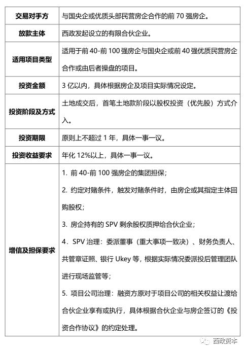 (3)風控及增信要求:需由融資方所屬集團對項目的開發建設進度及有限合伙企業的投資退出、收益實現等提供擔保,其中土地無需抵押。