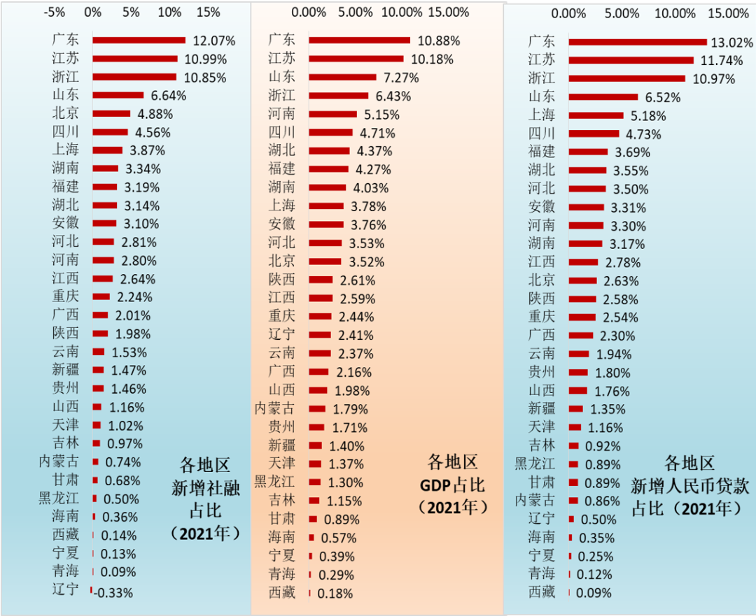 具體看,2021年廣東與浙江的GDP份額分別為10.88%與6.43%(合計占比17.31%),但其獲得的社融支持份額卻分別達到12.07%與10.85%(合計占比達到22.92%),獲得的人民幣貸款支持份額亦分別高達到13.02%和10.97%(合計占比達到23.99%)。
