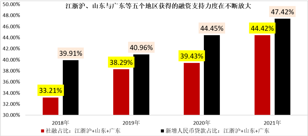 (一)五個地區合計獲得了全國44%以上的社融和47%以上的貸款支持