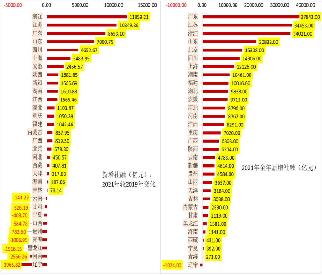 前面已經指出,2021年全國新增社融較2019年同期多增了5.78萬億,基于此理論上可以認為各地的2021年新增社融較2019年亦會對應出現明顯多增,但實際上我們仍然看到9個地區的2021年新增社融情況不如2019年。具體看,