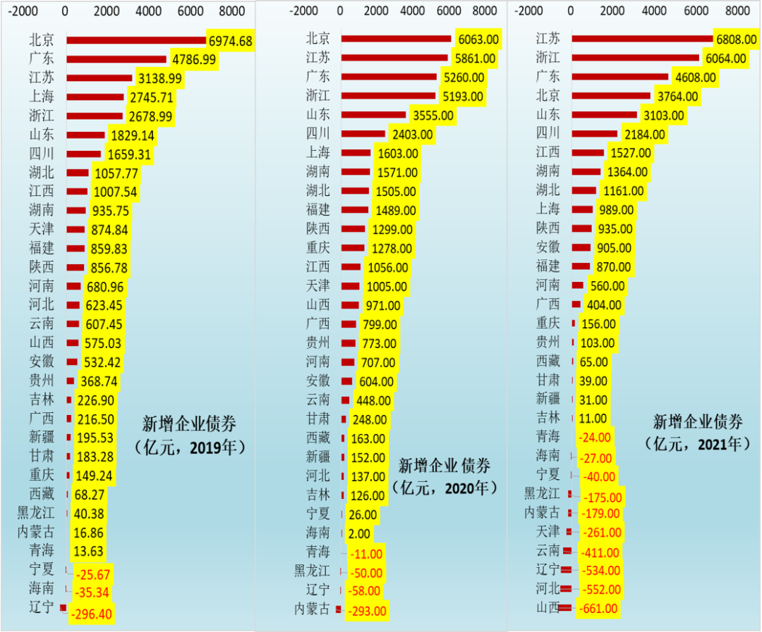 相較于貸款,從各地區歷年企業債券的新增情況上也許更能看出市場對該地區的評價好壞,畢竟企業債券的市場化程度更高、參與主體更豐富、評價更客觀。