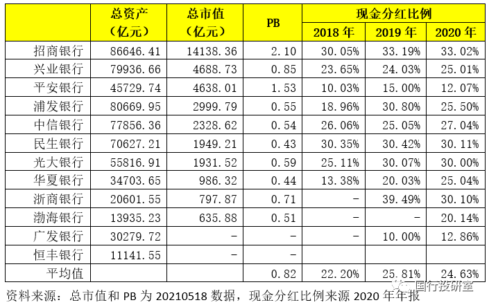2、2018-2020年股份行的現金分紅比例平均分別為22.20%、25.18%和24.63%。不過分紅比例與其市值之間并沒有對應關系,如分紅比例最高的招行其市值亦比較高,而市值較高的平安銀行其分紅比例卻僅有12.07%。