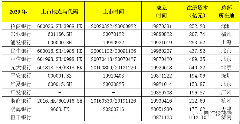 12家股份行中目前有10家上市,其中5家A+H股上市銀行(分別為招行、民生銀行、中信銀行、光大銀行與浙商銀行);4家純A股上市銀行(分別為興業銀行、浦發銀行、平安銀行與華夏銀行);1家純H股上市銀行(渤海銀行)。也即目前僅廣發銀行與恒豐銀行兩家股份行未實現上市目標。