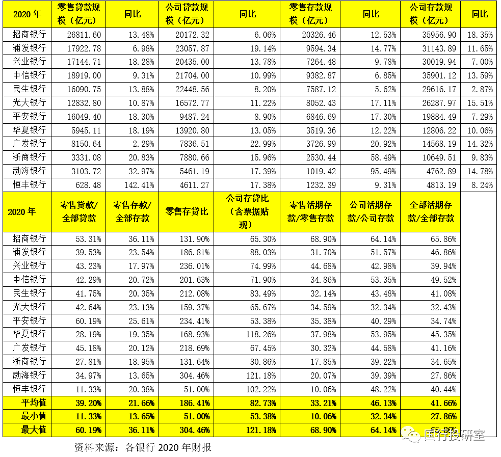 (1)截至2020年底,12股份行的零售存款和貸款余額分別為8.11萬億和14.69萬億,公司存款和貸款余額分別為25.64萬億和17.36萬億,票據貼現合計為2.25萬億。顯然,零售存貸比和公司存貸比(含票據貼現)的平均值分別為186.41%和82.73%,可以看出公司存款在股份行中多起到全行流動性的職能,重要性可見一斑。