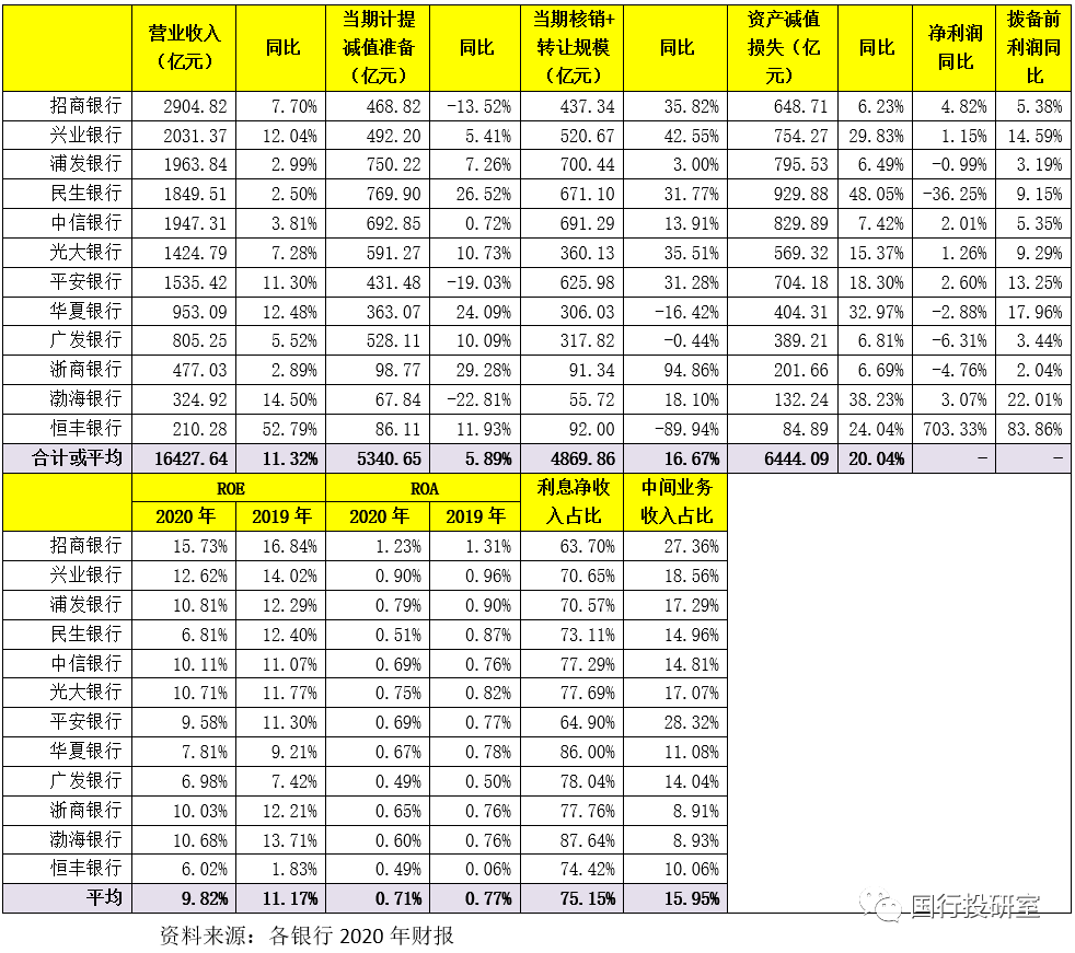 2、2020年,12家股份行的成本收入比為28.18%,較2019年下降2.32個百分點,成本收入比較低的銀行主要有浦發銀行(23.78%)、興業銀行(24.16%)和浙商銀行(25.96%),較高的銀行主要有恒豐銀行(39.47%)、招行(33.30%)、平安銀行(29.11%)。