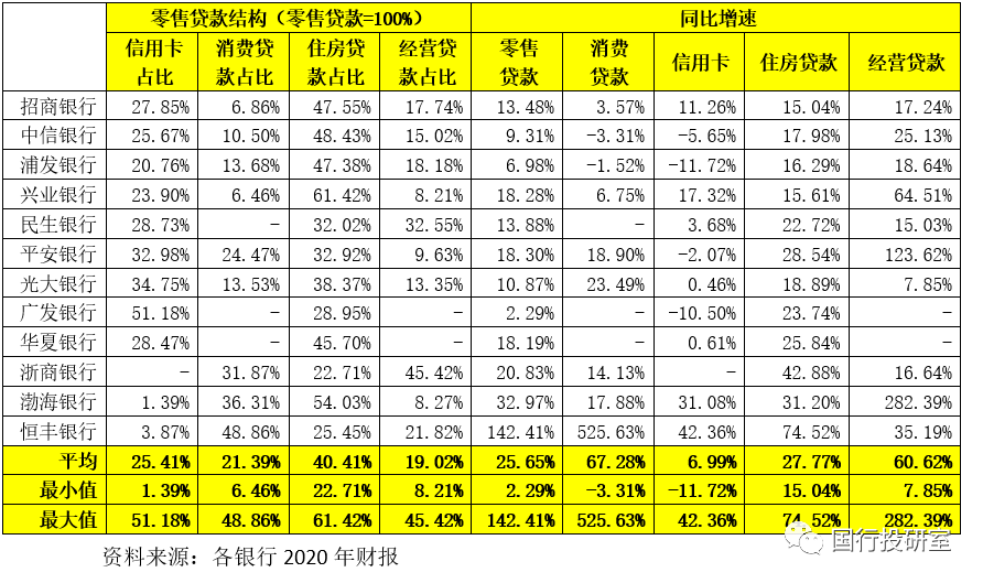 (3)對于情況比較特殊的恒豐銀行來說,其2020年零售貸款增長較為迅猛(增速高達142.41%),其中消費貸款猛增525.63%、住房貸款增74.52%、信用卡增42.36%。