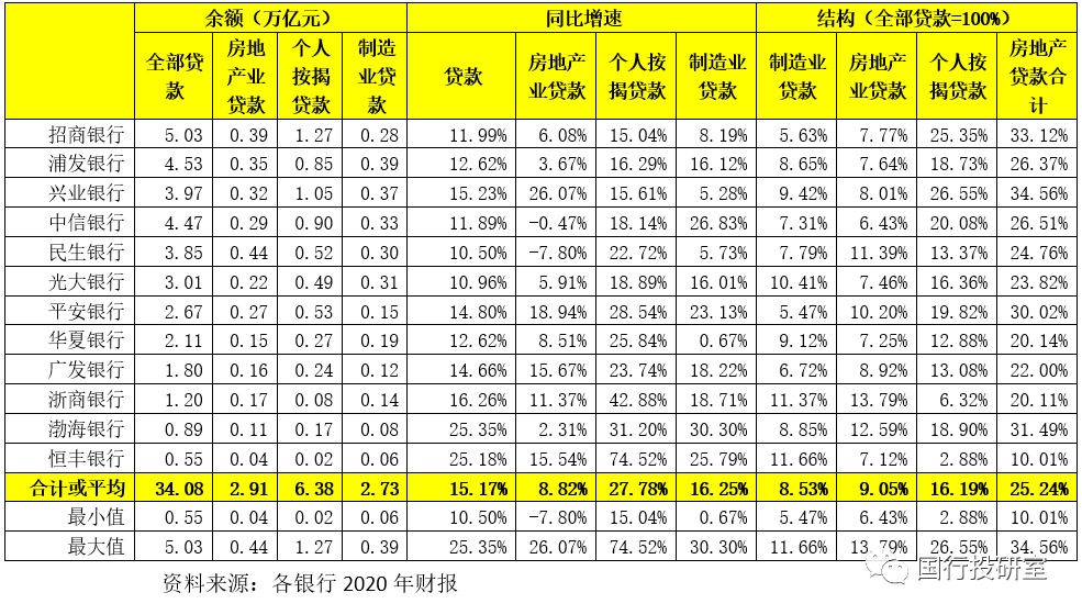 (1)截至2020年底,12家股份行的制造業貸款余額達到2.73萬億、個人住房貸款余額為6.38萬億(全部房地產貸款余額為9.29萬億)。