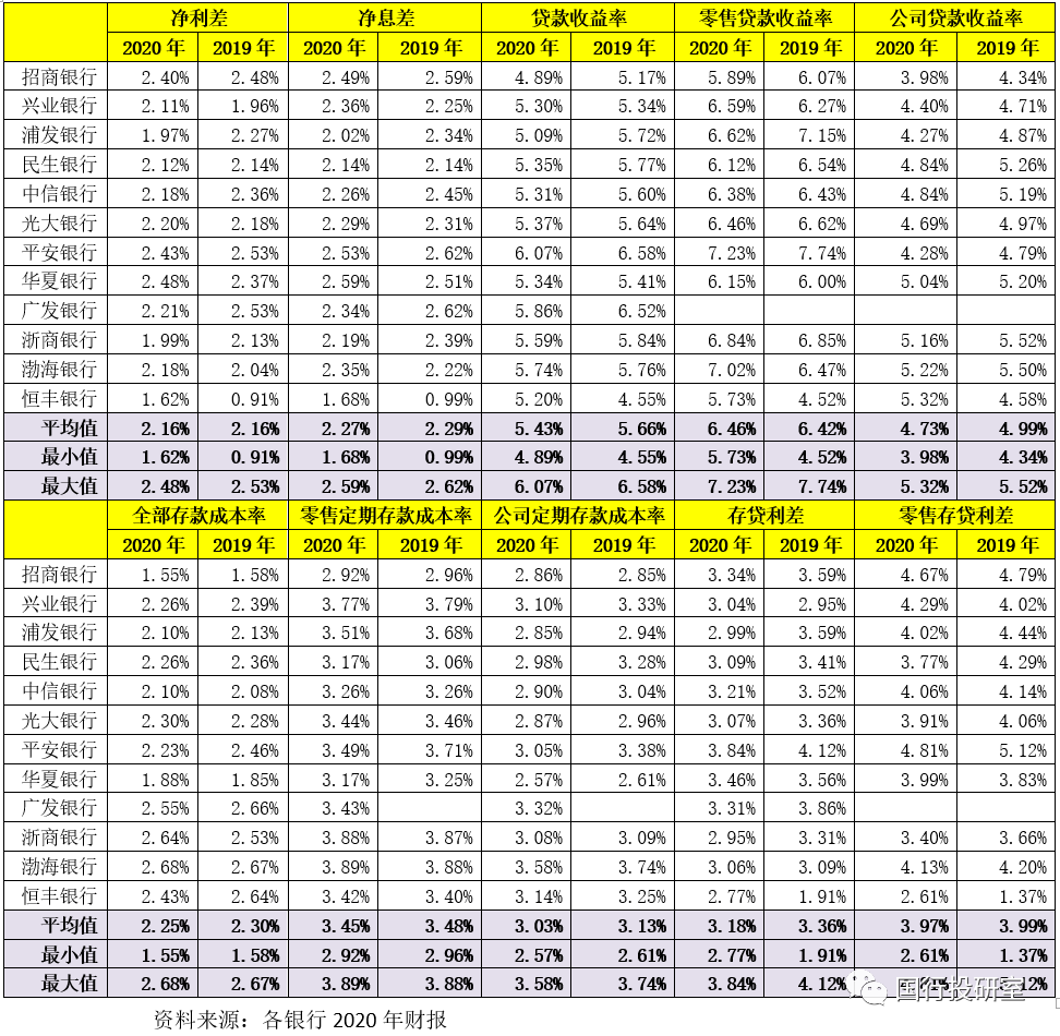 2020年,12家股份行的存款利率平均為2.25%,其中零售定期存款與公司定期存款的平均利率分別為3.45%和3.03%。招行和華夏銀行的存款利率分別低至1.55%和1.88%,渤海銀行(2.68%)、浙商銀行(2.64%)的存款成本相對較高。