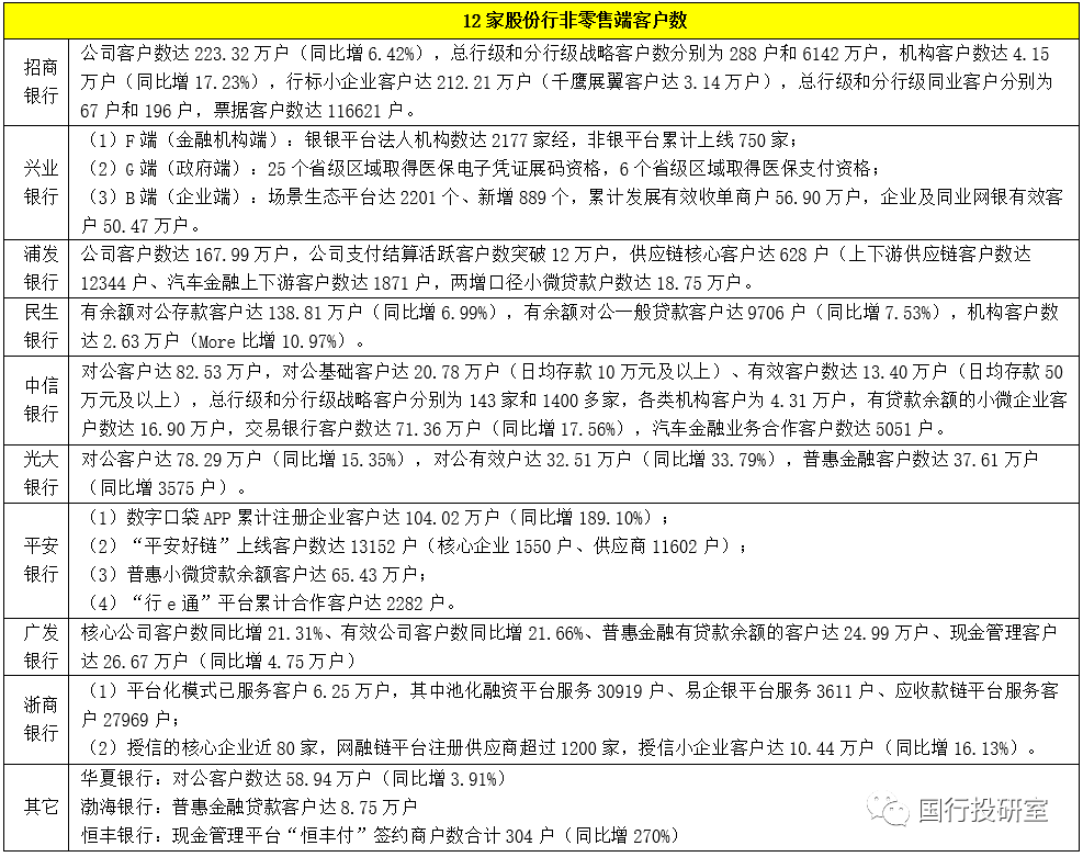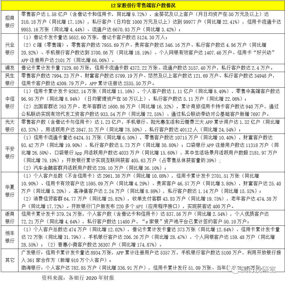 2、在關注借記卡和信用卡的卡量之外,目前多數股份行還會對零售客戶進一步分類,如分為普通零售客戶數、財富客戶數、高凈值客戶數與私行客戶數,同時對手機銀行客戶數、APP注冊用戶數與月活躍用戶數等指標還特別重視。