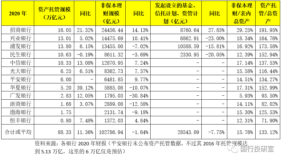 除傳統表內業務外,以非保本理財和資產托管為代表的表外業務亦是股份行的亮點(實際上目前頭部城商行亦在這兩類業務上發力)。截至2020年底,12家股份行的資產托管和非保本理財余額合計分別達到88.83萬億和10.28萬億,占表內總資產的比例平均值分別達到15.76%和133.12%。