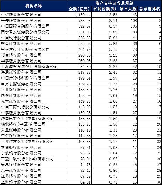 一、全市場(chǎng)ABS總承銷(xiāo)排名