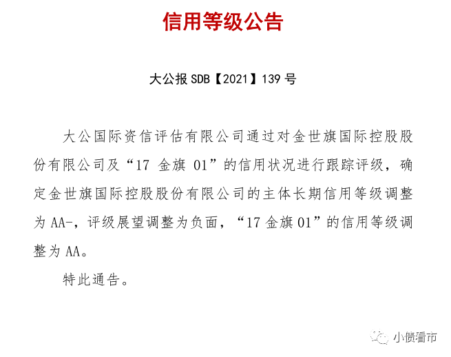 8月31日,大公國際將金世旗國際控股股份有限公司(以下簡稱“金世旗控股”)的主體長期債務(wù)評級從AA下調(diào)至AA-,評級展望調(diào)整為負(fù)面,“17金旗01”信用等級調(diào)整為AA。