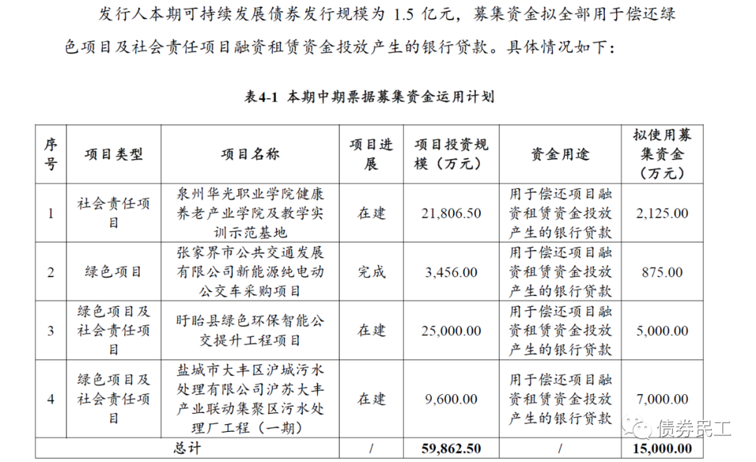 本期債券的發(fā)行規(guī)模為1.5億元,發(fā)行期限為2年。根據(jù)公開披露的信息,本次債券的募集資金用途為償還綠色項(xiàng)目及社會責(zé)任項(xiàng)目融資租賃資金投放產(chǎn)生的銀行貸款,共涉及到4個項(xiàng)目,分別屬于社會責(zé)任項(xiàng)目和綠色項(xiàng)目路。與此同時,募集說明書同時披露了4個募投項(xiàng)目的經(jīng)濟(jì)效益、社會效益和環(huán)境效益。