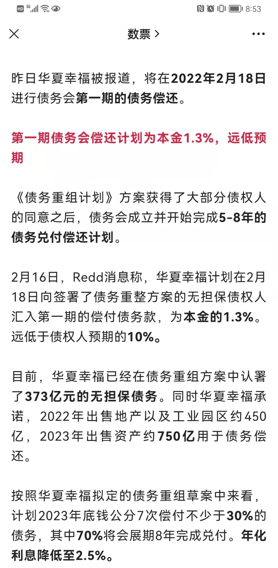 一張來自有關自媒體(數票)總結歸納的還款計劃圖,將事情本來的面貌公之于眾。看完信息之后五味雜陳,對于華夏幸福而言,此次債務償還十分不理想;對于金融機構而言,這樣的還款計劃只能說聊勝于無。