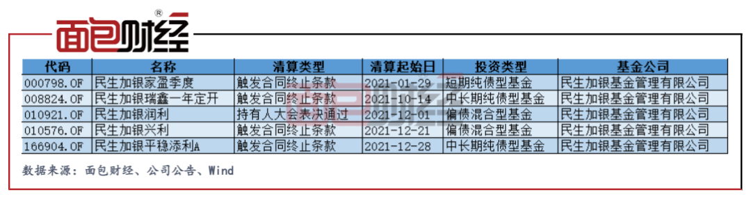 數(shù)據(jù)顯示,按照清算起始日測算,民生加銀基金2021年共有5只基金清算(初始基金口徑),其中4只因為觸發(fā)合同終止條款,1只因為持有人大會表決通過。