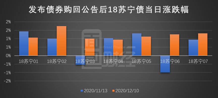 此前,基于對蘇寧集團償付能力的擔憂,蘇寧集團旗下債券跌幅較大。為了增強投資者信心,蘇寧易購分別在2020年11月和12月發出用自有資金購回18年公開發行的公司系列債券的公告,計劃的債券購回資金總額分別為10億元和20億元。目前第一次債券購回資金已于2020年12月14日足額到賬,第二次債券購回資金也已足額支付。