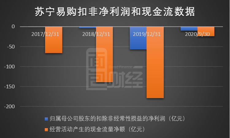 根據蘇寧易購近三年披露的年報和2020年的三季度季報,公司經營活動產生的凈現金流和同期的公司扣非凈利潤持續為負。