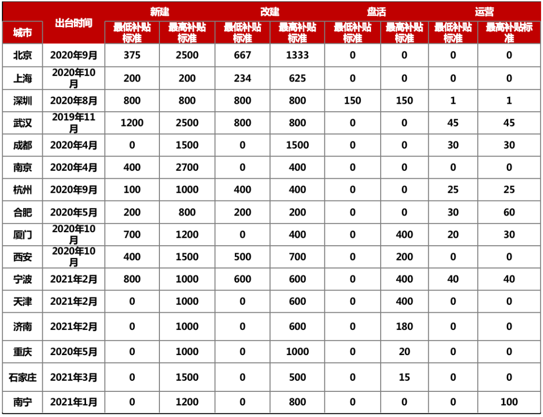 截至目前,在中央財(cái)政支持住房租賃市場(chǎng)發(fā)展試點(diǎn)入圍的24個(gè)城市中,已經(jīng)有16個(gè)城市(北京、上海、深圳、武漢、成都、南京、杭州、合肥、廈門、西安、寧波、天津、濟(jì)南、重慶、石家莊、南寧)已經(jīng)公布了中央財(cái)政支持住房租賃市場(chǎng)發(fā)展試點(diǎn)專項(xiàng)資金管理辦法,因城施策,不同城市之間補(bǔ)貼標(biāo)準(zhǔn)差異較大。整體來(lái)看,補(bǔ)貼以新建、改建類項(xiàng)目補(bǔ)貼為主,部分城市對(duì)盤活類、運(yùn)營(yíng)類項(xiàng)目有補(bǔ)貼。