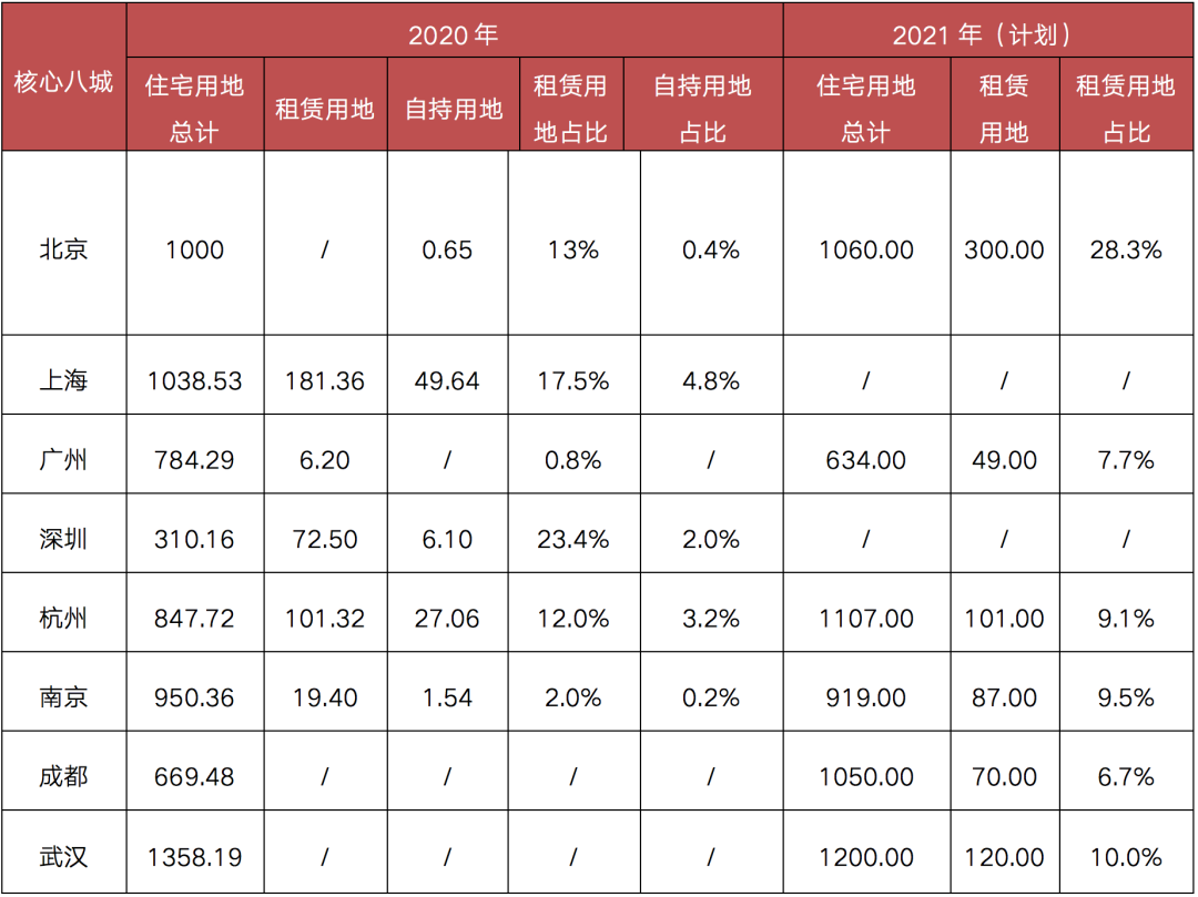 在克而瑞租售長(zhǎng)期關(guān)注的核心八城中,以一線城市北京為例,從2021年北京的供地計(jì)劃可以看出,2021年北京將持續(xù)增加住宅用地供應(yīng)量,提高租賃住宅用地占比。具體來(lái)看,2021年計(jì)劃安排住宅用地1060公頃,較2020年計(jì)劃安排量增加60公頃。與此同時(shí),土地供應(yīng)向租賃住宅傾斜,在單列租賃住宅用地的基礎(chǔ)上,按照商品房供應(yīng)下限等比例安排租賃住宅供應(yīng)指標(biāo),將租賃住宅占住宅用地比重由2020年的13%提高到28.3%。
