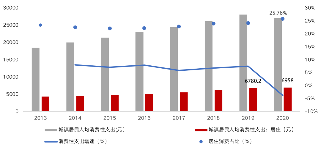 自中國(guó)經(jīng)濟(jì)發(fā)展模式由投資驅(qū)動(dòng)逐步轉(zhuǎn)為重視消費(fèi)驅(qū)動(dòng)以來(lái),我國(guó)國(guó)民消費(fèi)水平一直保持著穩(wěn)定的增長(zhǎng)速度。2020年,我國(guó)城鎮(zhèn)居民人均消費(fèi)支出27007元,與2013年相比增長(zhǎng)了46.08%,其中25.76%為居民居住性消費(fèi)支出。