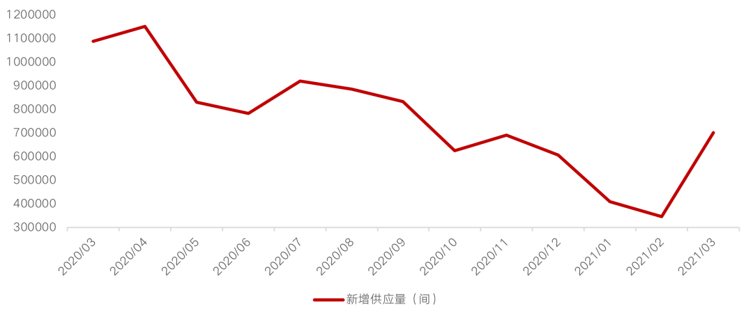 房源供應(yīng)層面,由于各地城市鼓勵(lì)員工留城過(guò)春節(jié),大大減少了房源空置現(xiàn)象,因此1-2月各城市新增供應(yīng)房源大幅下跌:1月,55城個(gè)人房源新增供應(yīng)407218間,環(huán)比下跌32.66%,2月新增供應(yīng)344347間,環(huán)比下跌15.44%。伴隨疫情逐步好轉(zhuǎn),抑制的租賃需求得以釋放,加之年底大批租賃房源租期到期,3月整體新增供應(yīng)顯著提升,環(huán)比上升103.65%。