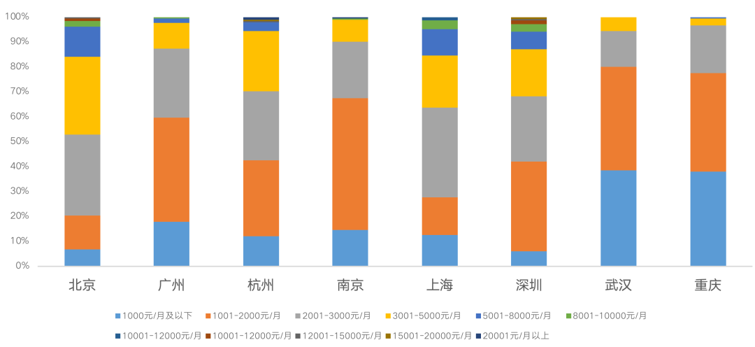 整體來(lái)看,北京和上海租賃市場(chǎng)中2000-3000元/月占比較高,其他六城2000元/月占比較高,中低端租賃需求仍是市場(chǎng)主力。