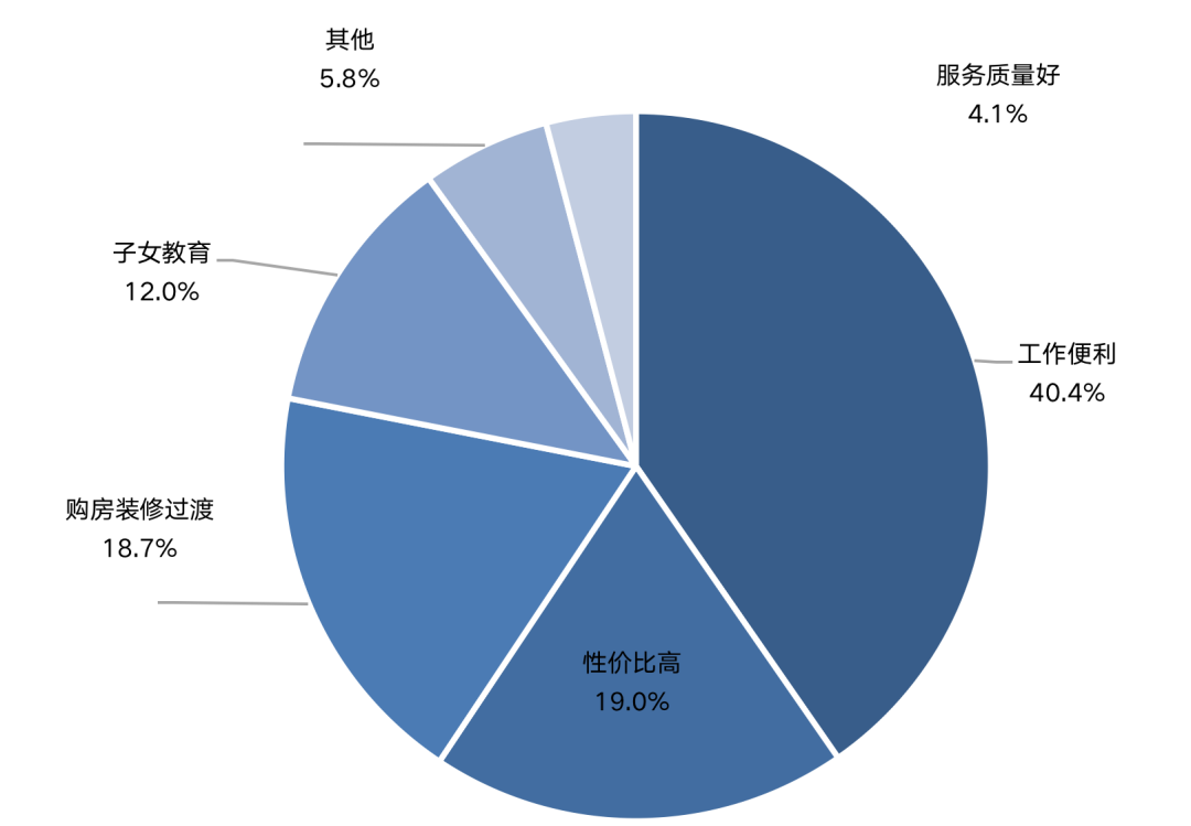 其中,本地有房租房的客群多因工作便利、性價(jià)比高、裝修過(guò)渡等因素租房。在本地有房租房原因中,工作便利占比最高,約達(dá)40.4%,其次是性價(jià)比高、購(gòu)房裝修過(guò)渡以及子女教育,三者各自所占比重均超過(guò)10%。伴隨著一、二線城市的房?jī)r(jià)高企,租房也成為一種性價(jià)比較高的居住方式。