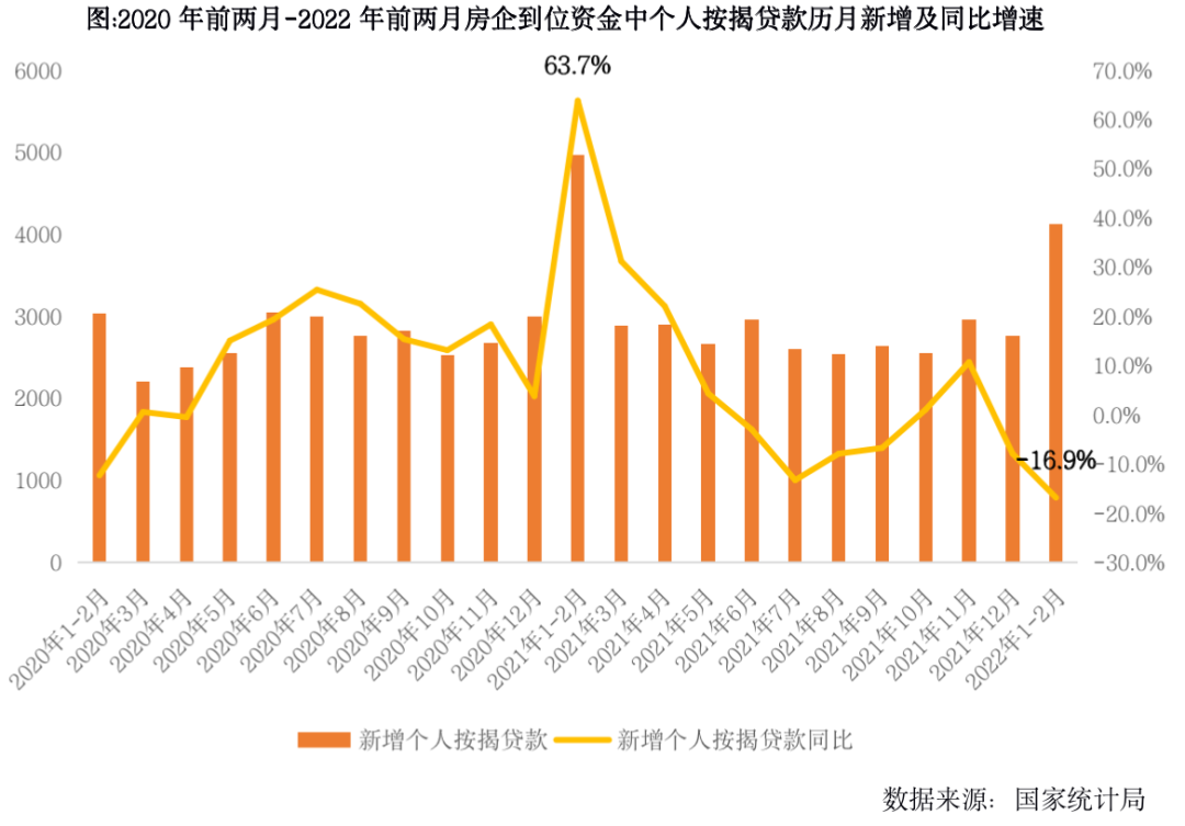 房地產(chǎn)開發(fā)企業(yè)各項(xiàng)到位資金中,個(gè)人按揭貸款同比跌幅進(jìn)一步擴(kuò)大。2021年12月,新增個(gè)人按揭貸款2755億元,同比轉(zhuǎn)跌8%。2022年1-2月,新增個(gè)人按揭貸款4124億元,同比下降16.9%,同比跌幅較2021年末擴(kuò)大8.9個(gè)百分點(diǎn)。